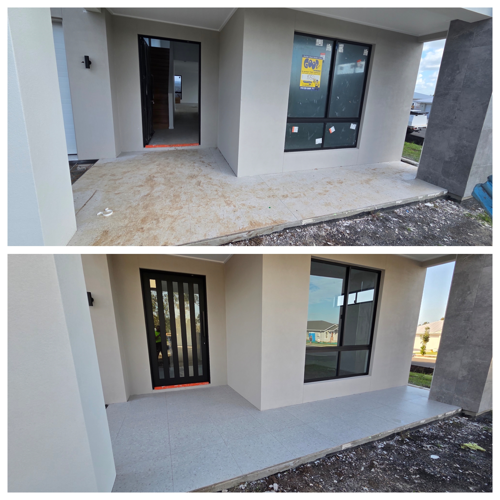 Internal builder clean, exterior washdown and pressure-cleaned paths.